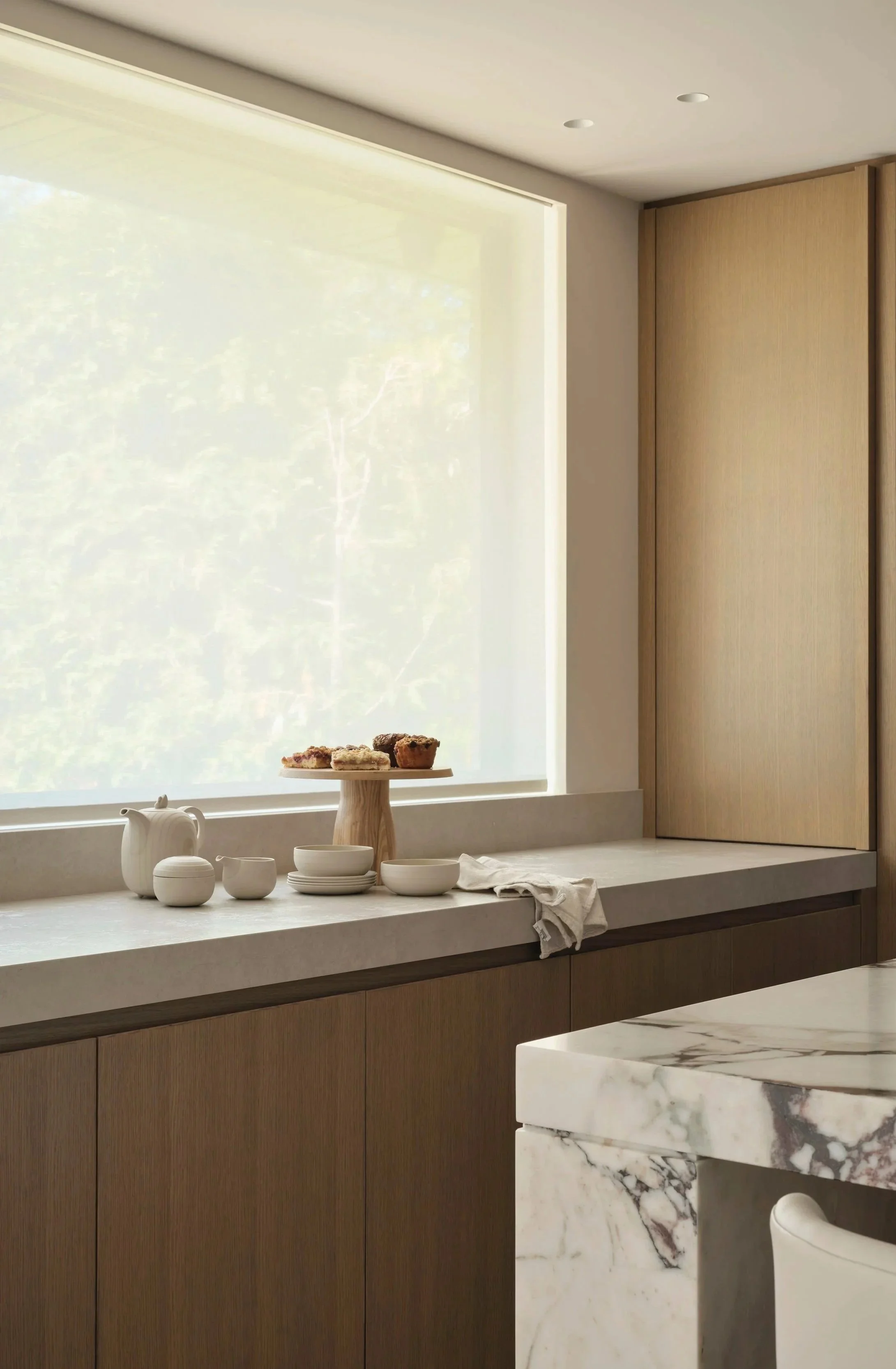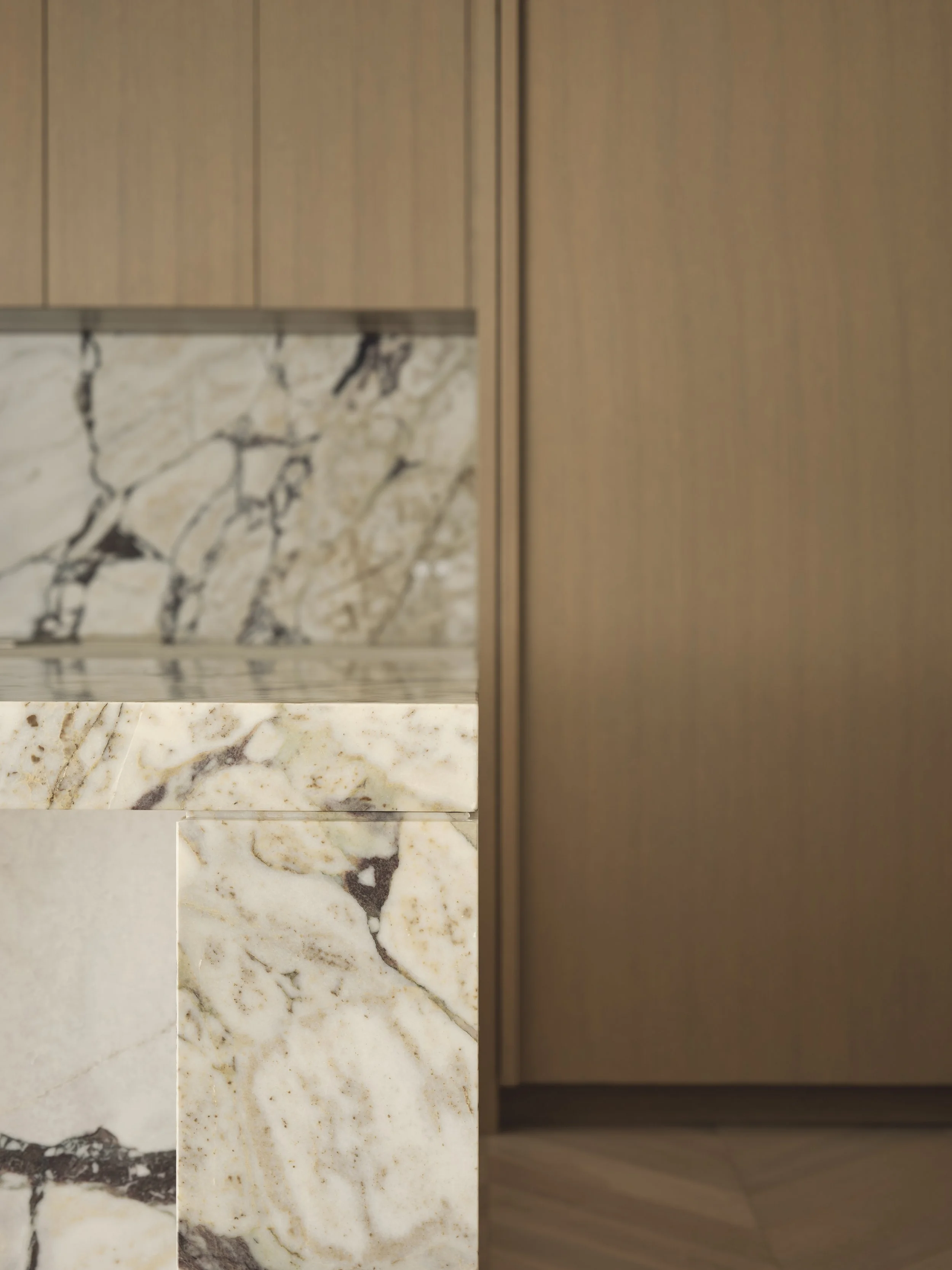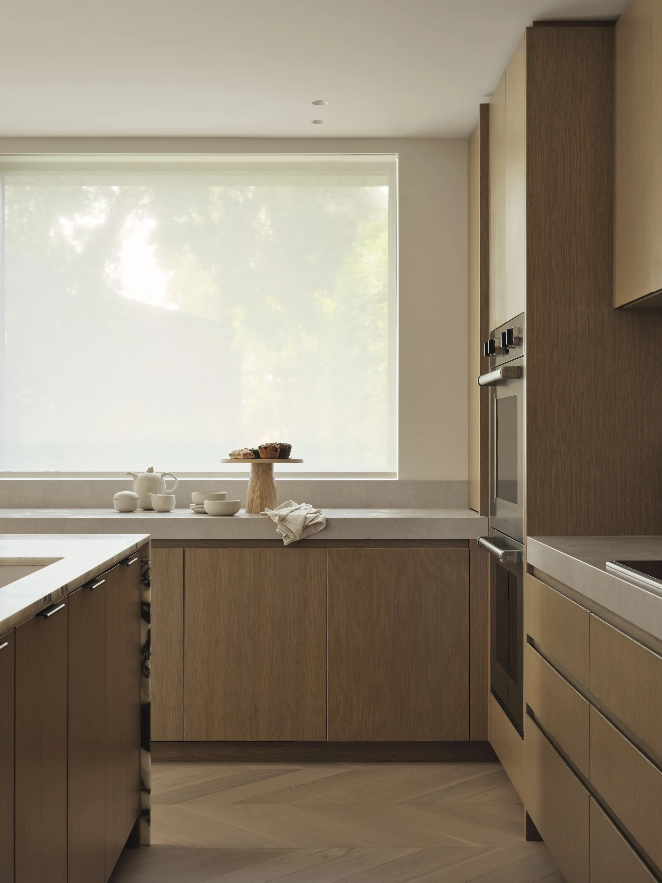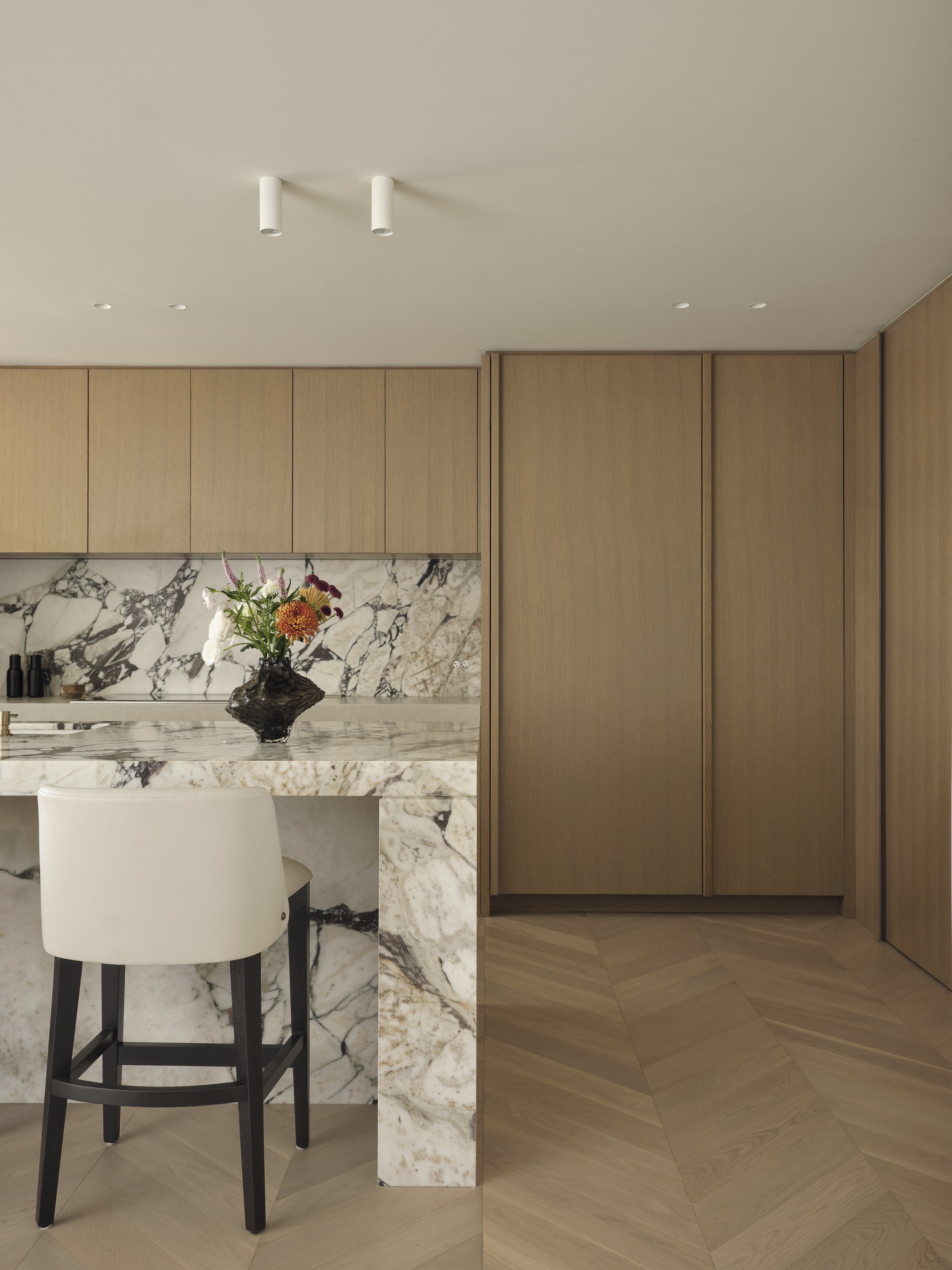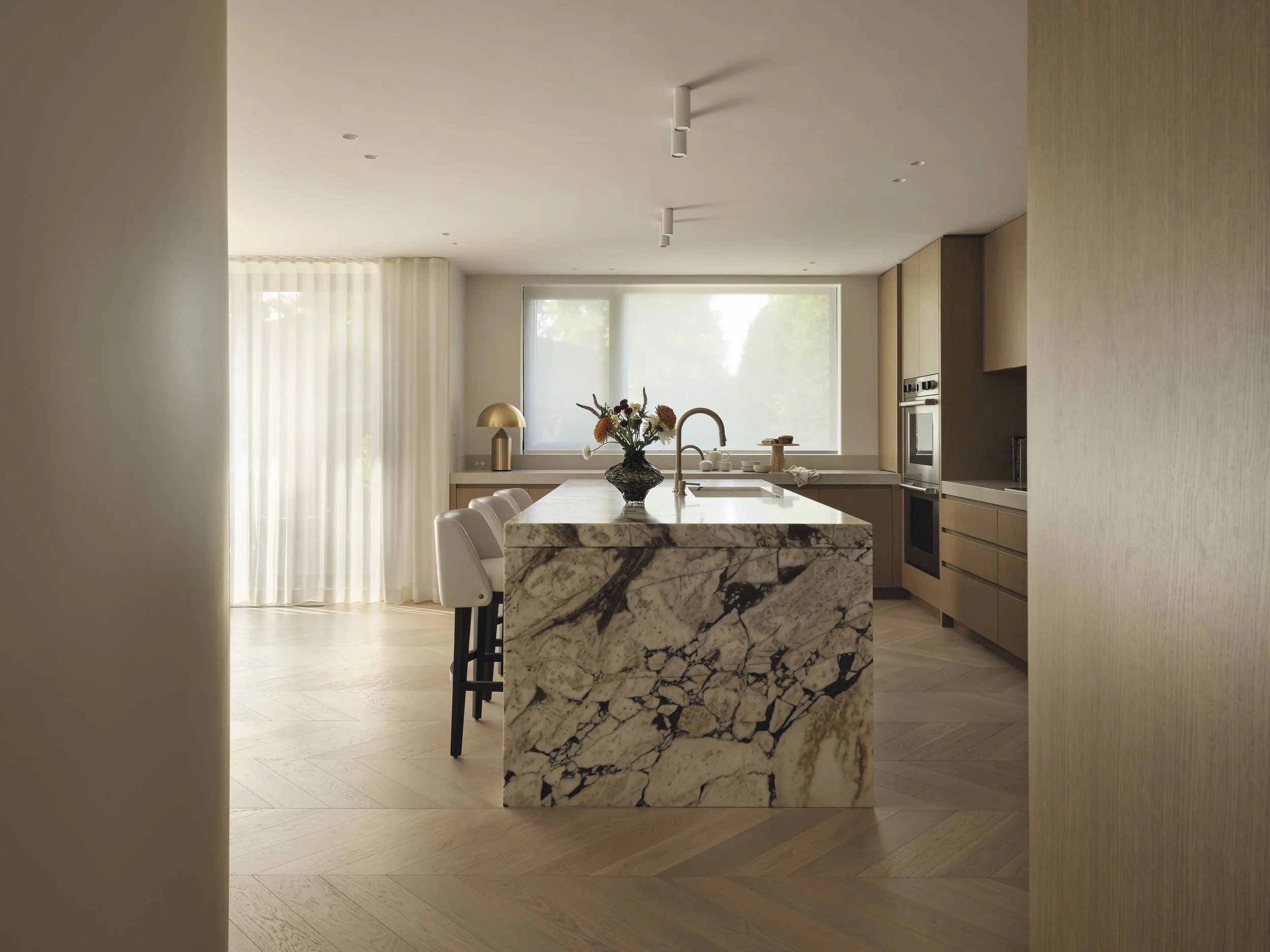 The kitchen design features a Calacatta Viola marble block island and backsplash against a minimalist white oak paneled kitchen with a concealed fridge, freezer panel and walk-in pantry. The Champagne Bronze finish faucet plays beautifully off of the eggplant tones in the veining of the marble.