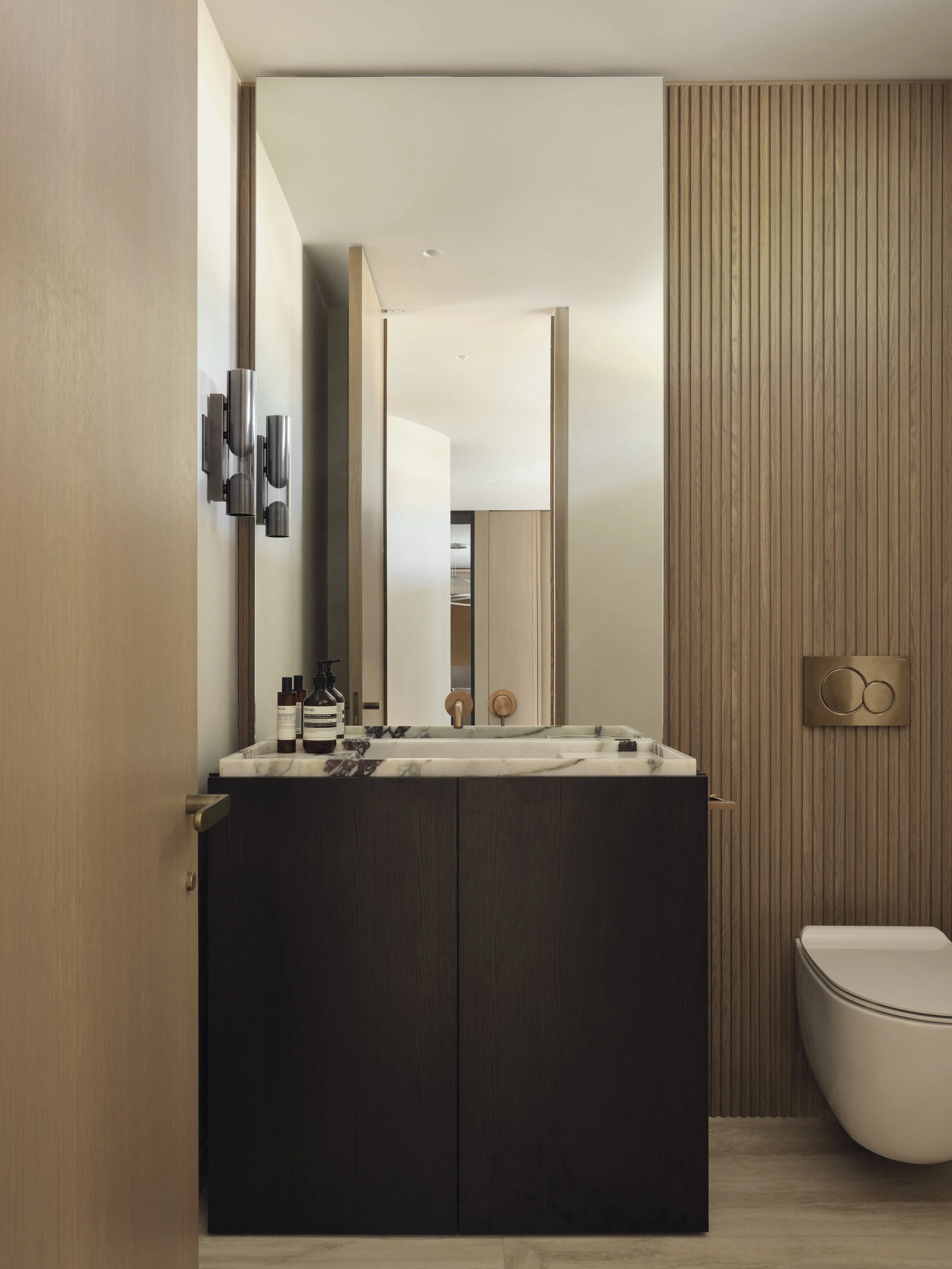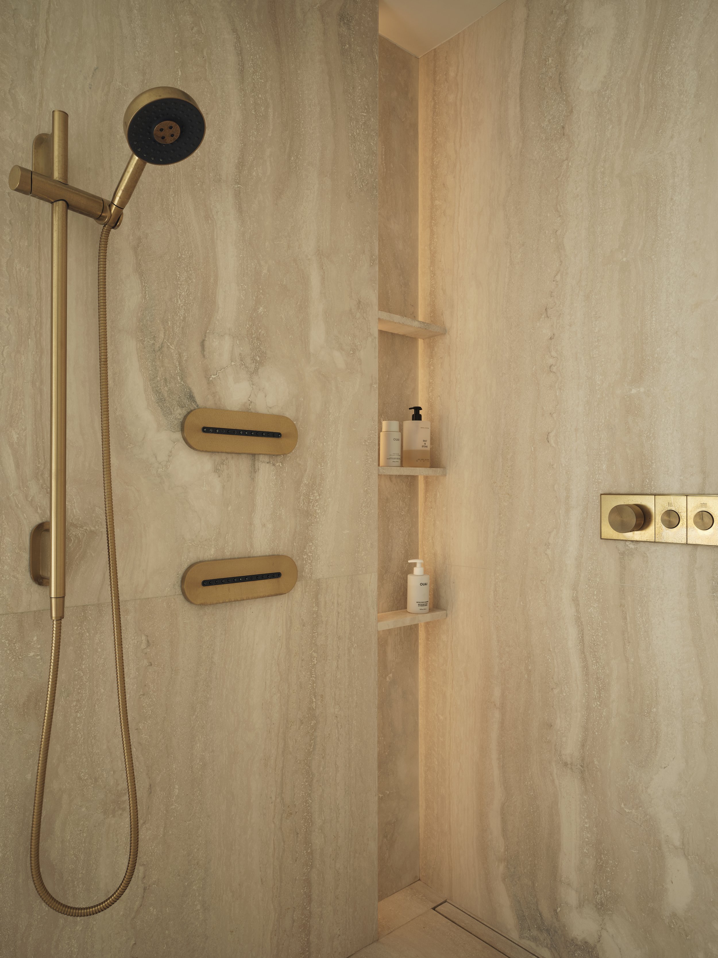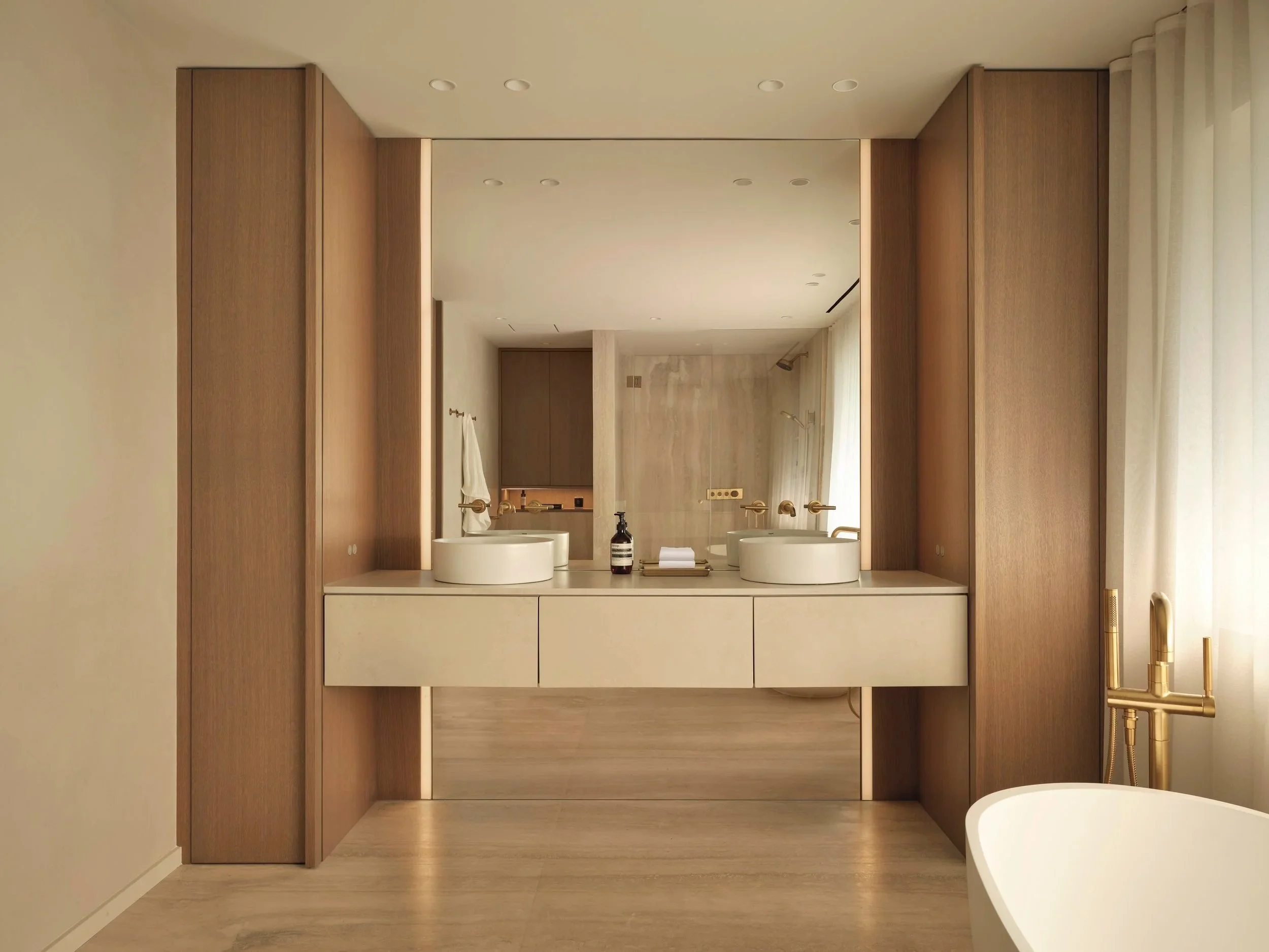 The Principal Bathroom showcases Travertine slabs, brass fixtures, and the same oak millwork found throughout the home, complemented by micro-cement on walls and ceiling for added texture and depth.