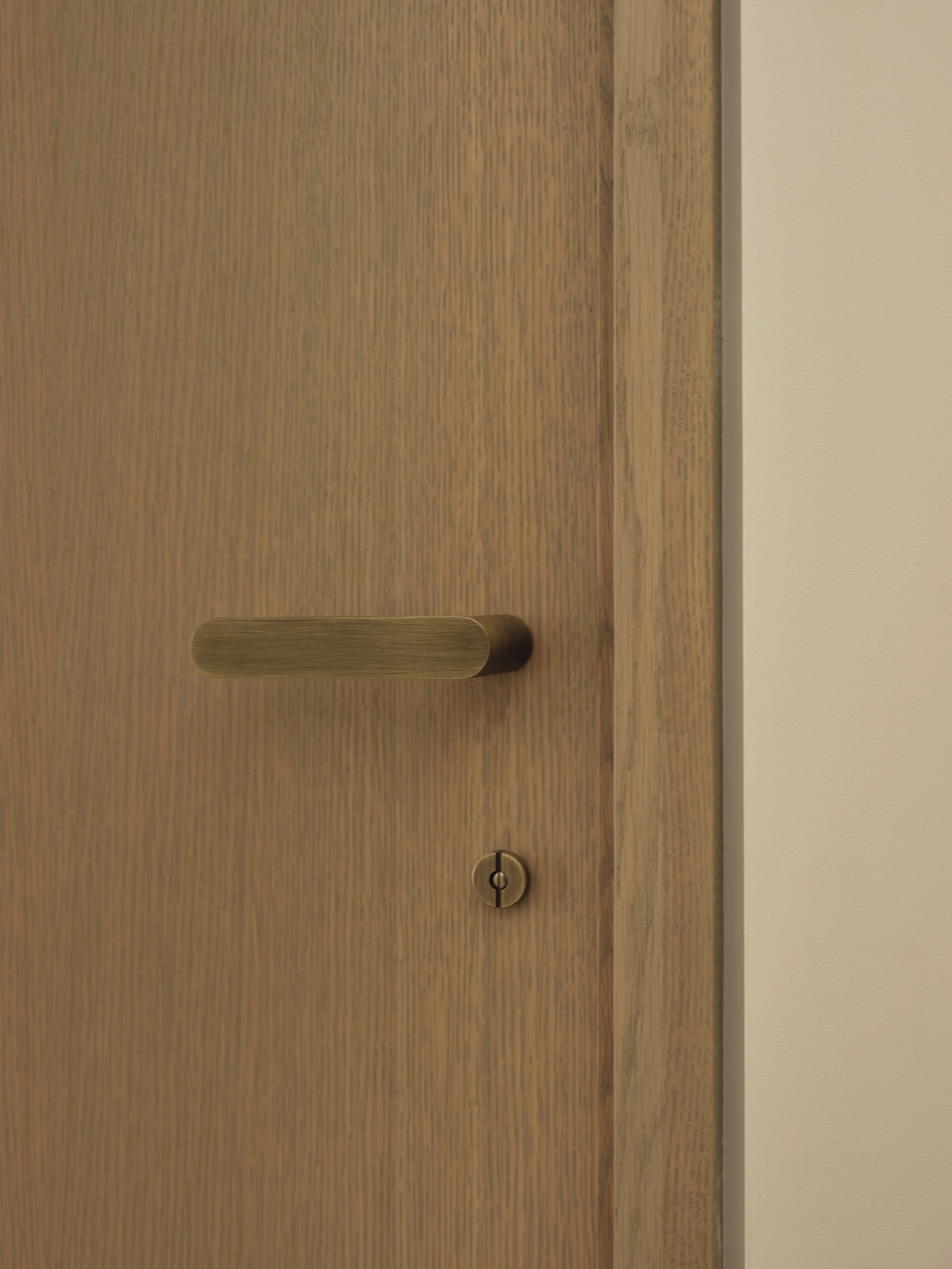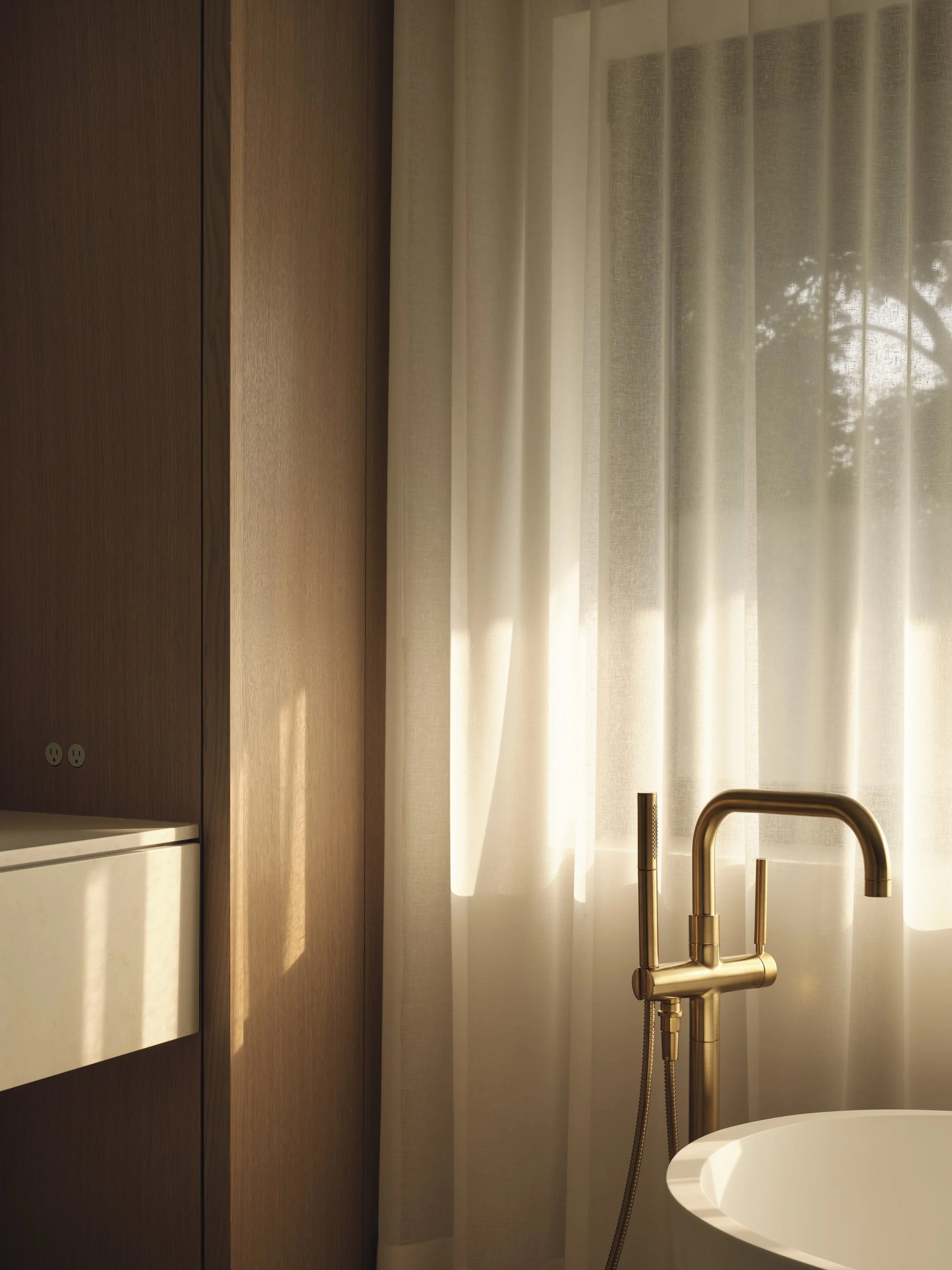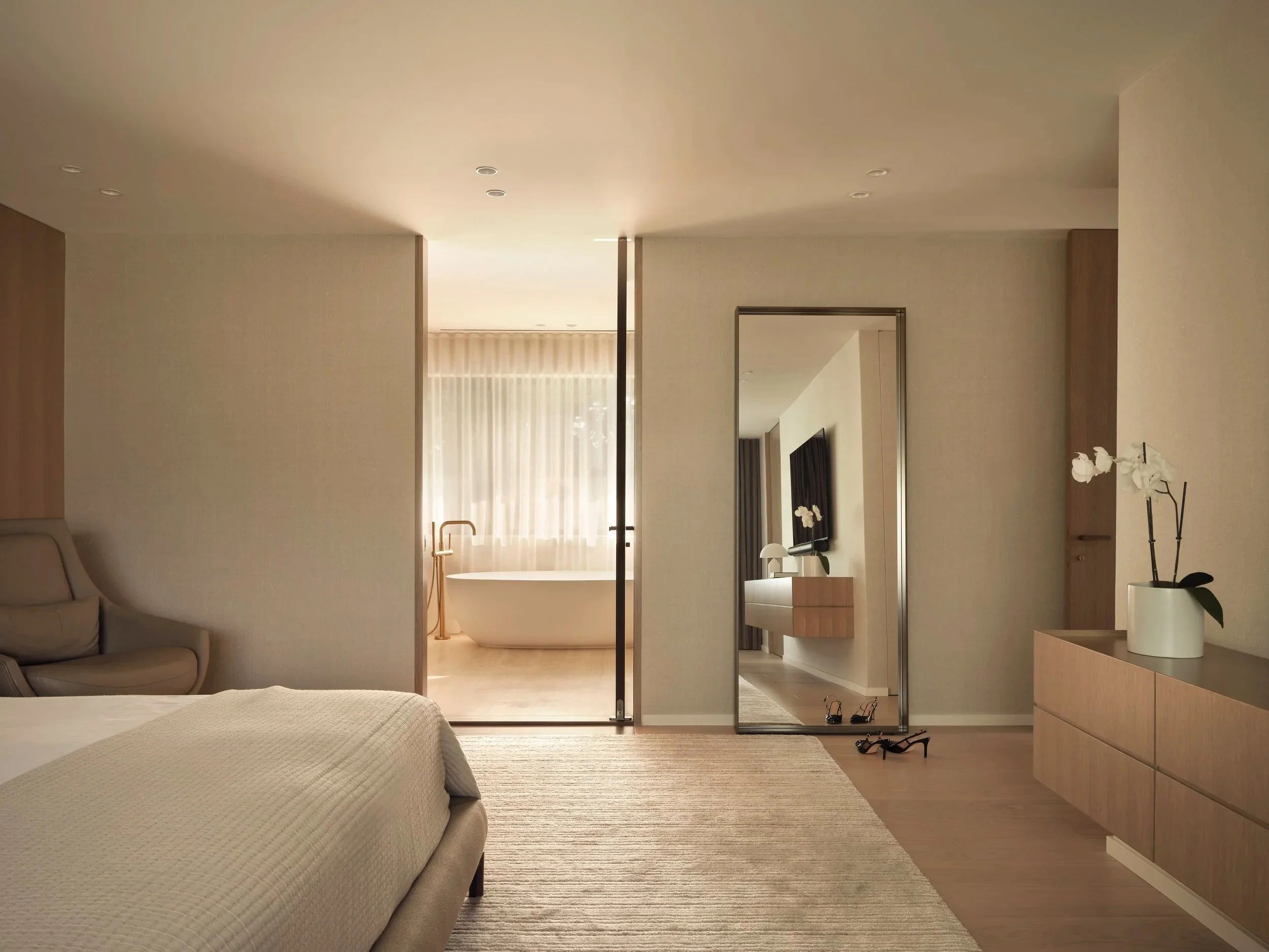 The Principal Bathroom showcases Travertine slabs, brass fixtures, and the same oak millwork found throughout the home, complemented by micro-cement on walls and ceiling for added texture and depth.