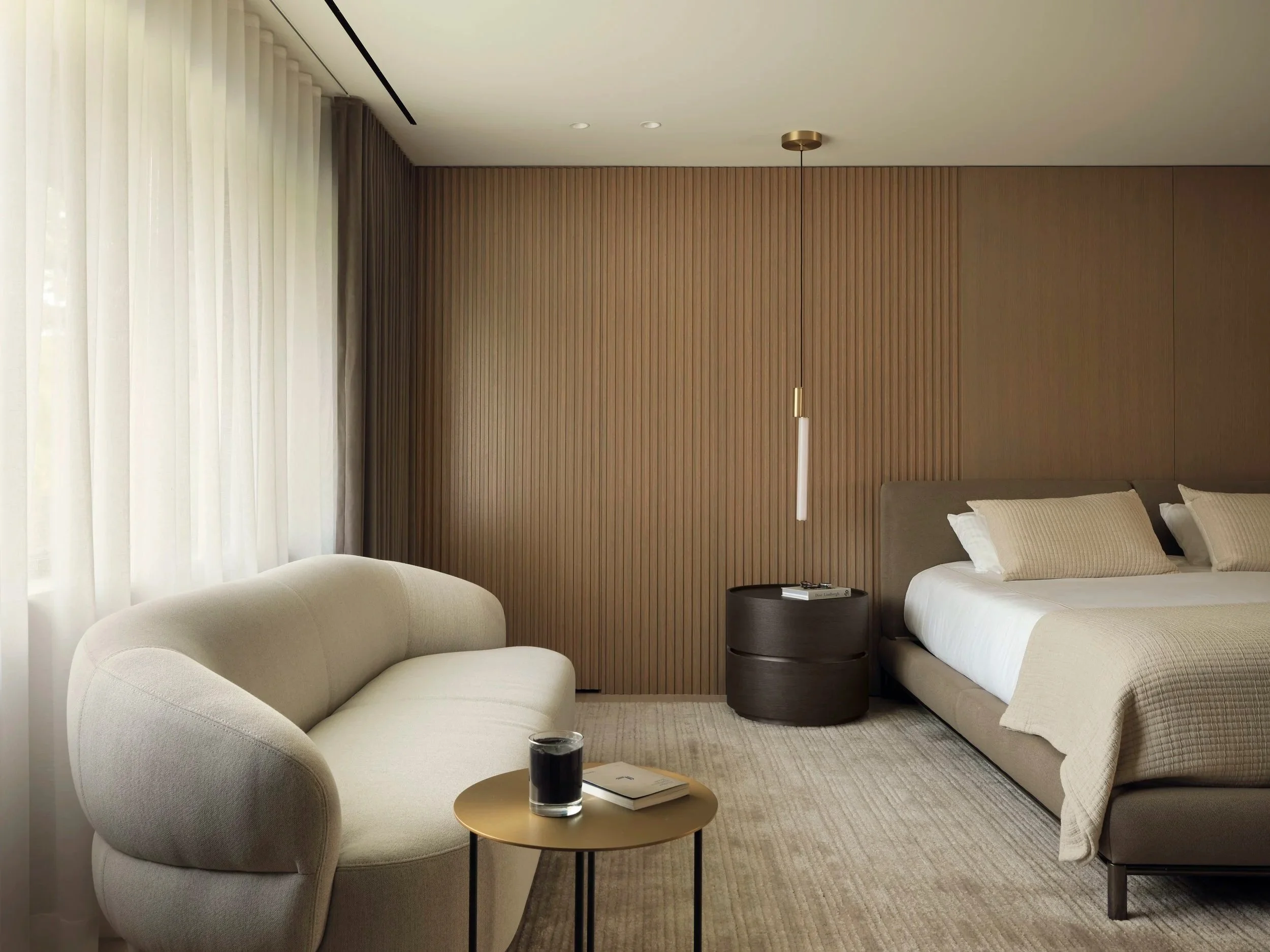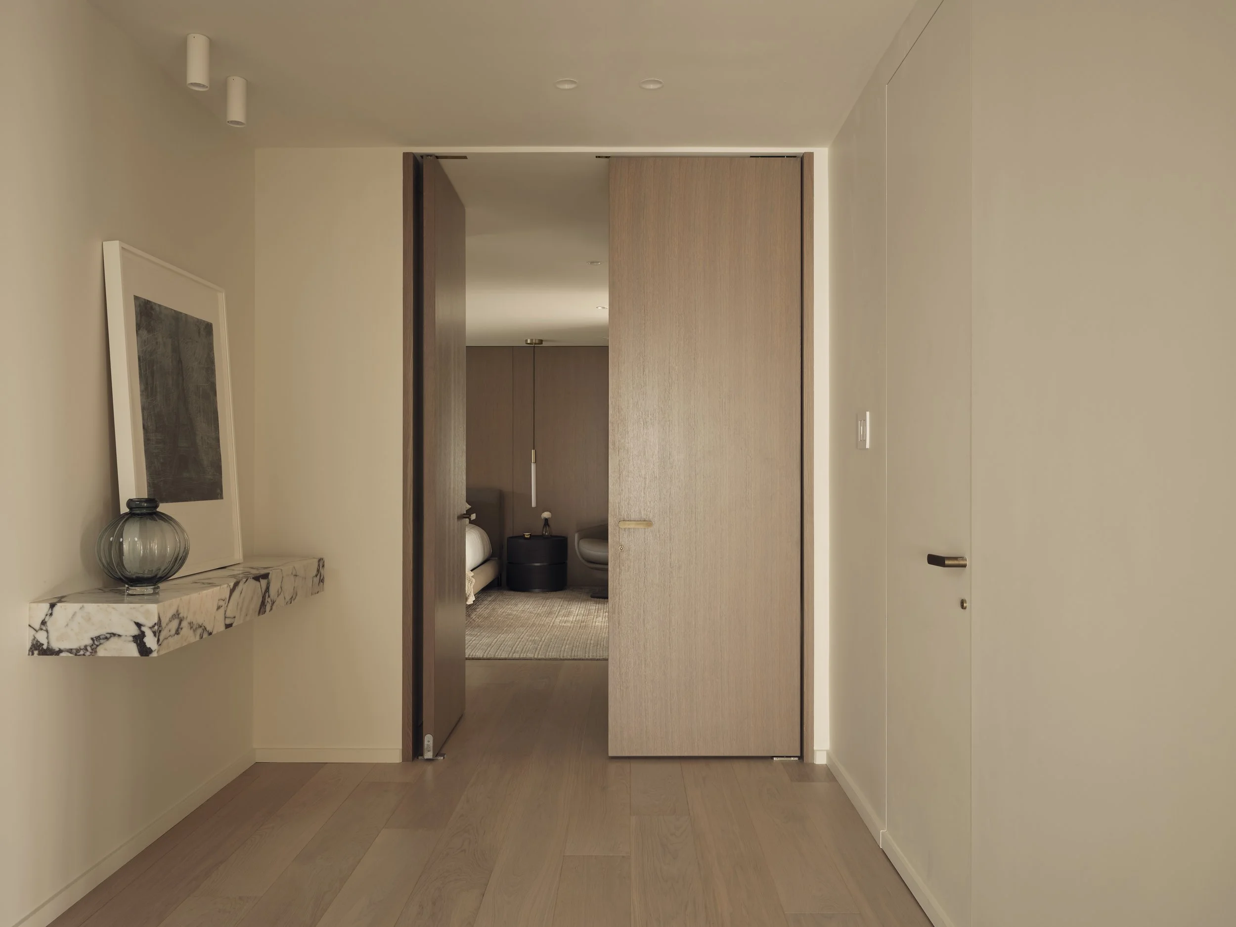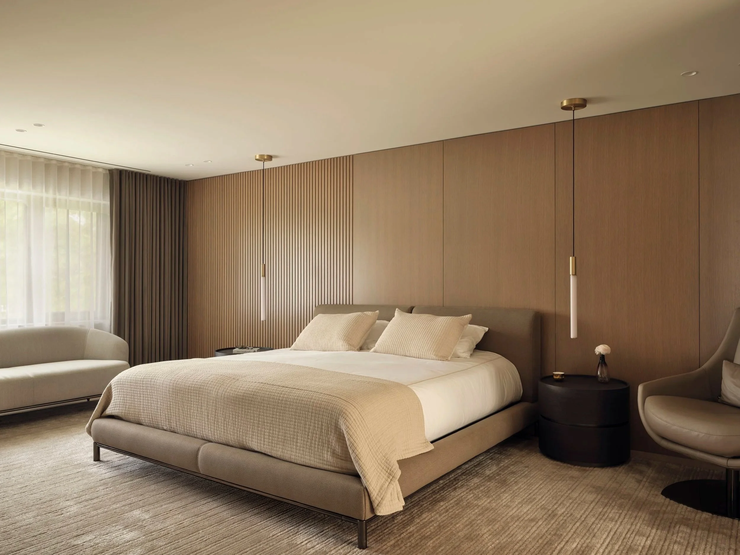 The Principal Suite is defined by double oak veneer pivot doors and oak wall paneling, seamlessly concealing a hidden entrance to “His Closet.” A custom area rug anchors the space, enhancing the warm, hotel-inspired ambiance.