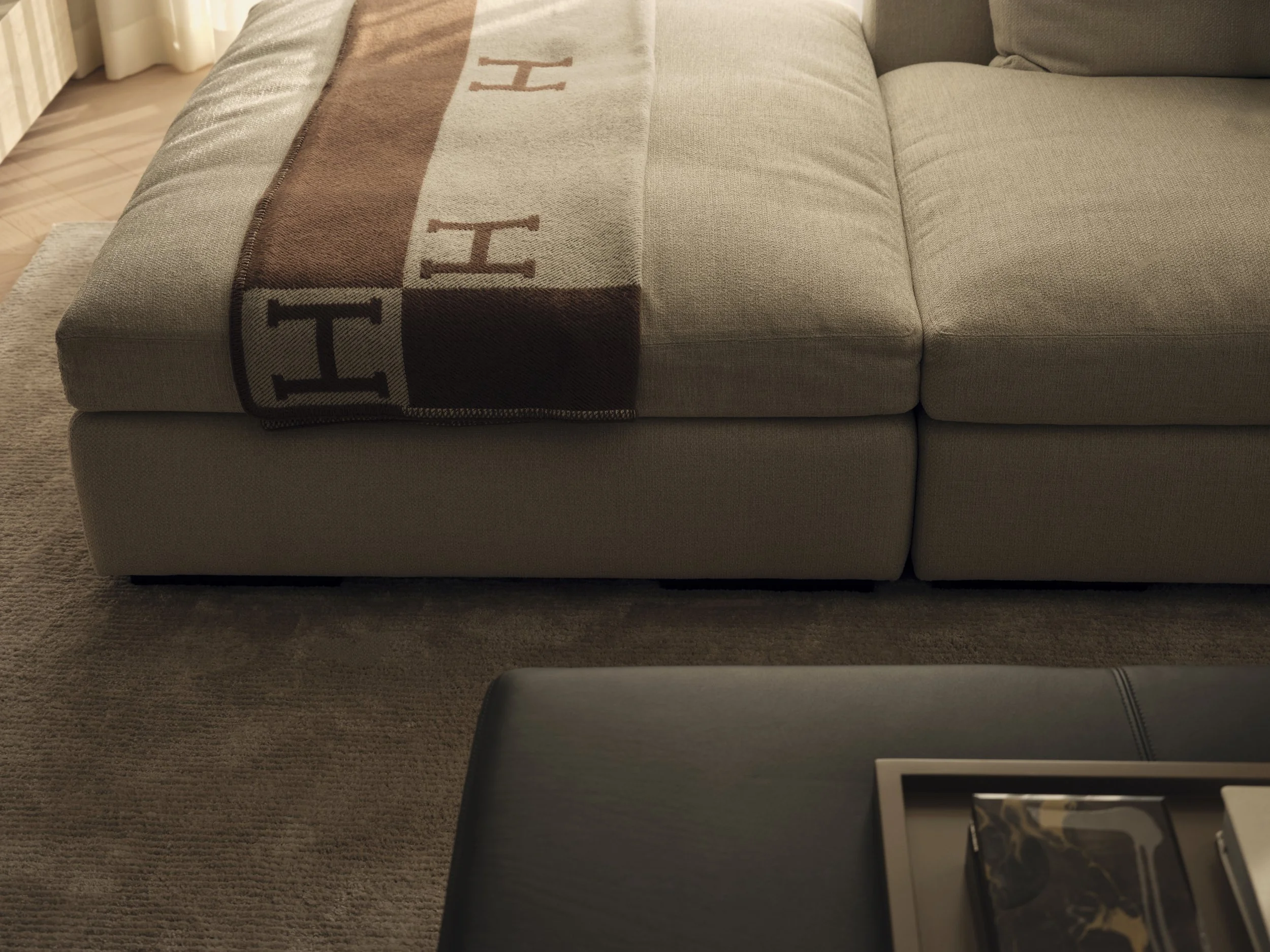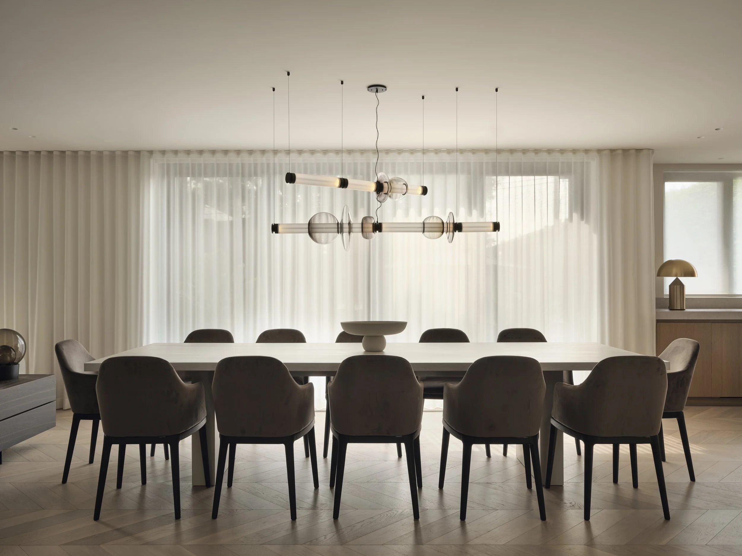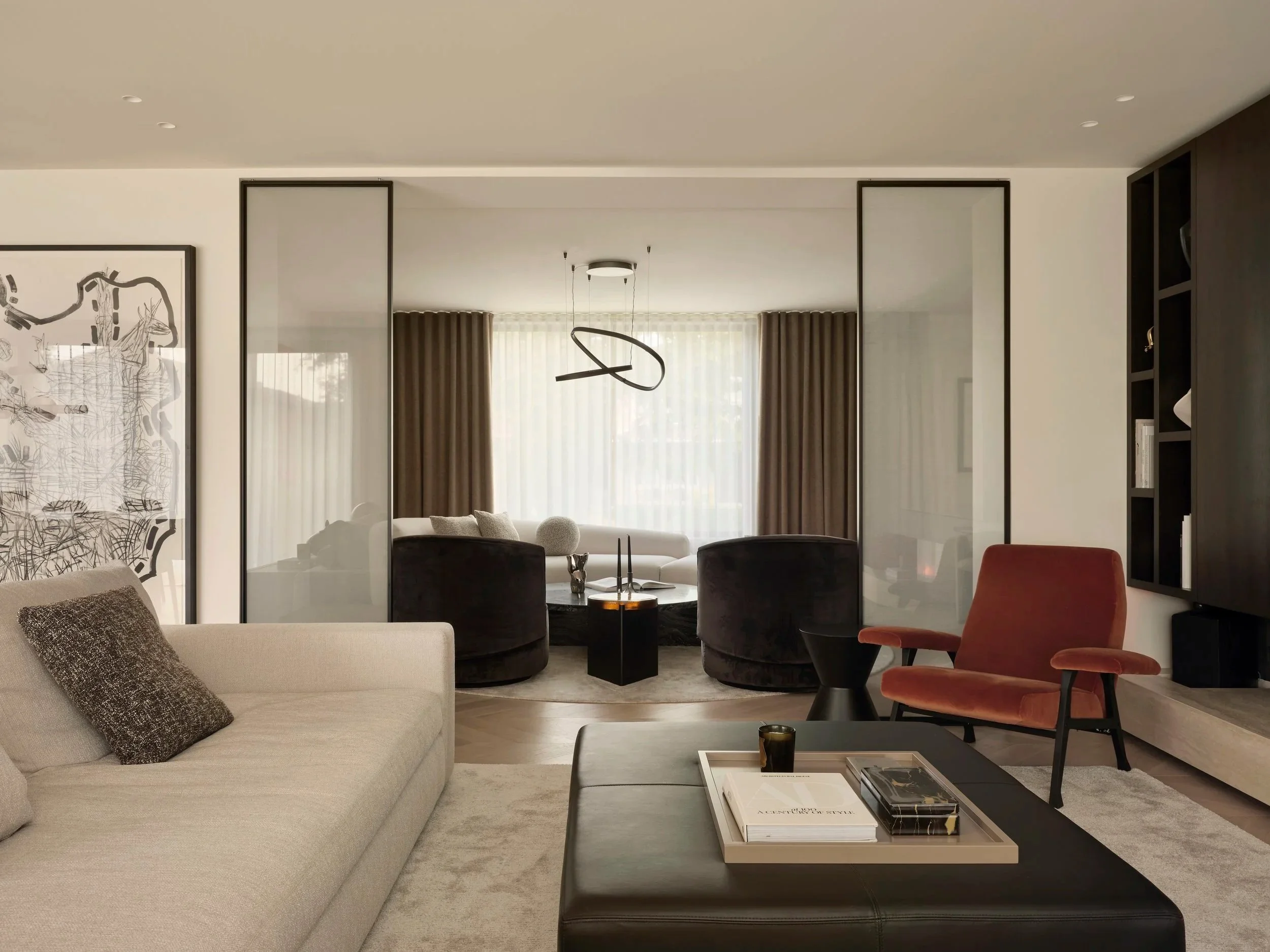 Fabric-lined glass panels elegantly divide the living and family rooms, creating a subtle sense of privacy while adding a layer of refined sophistication to the space.