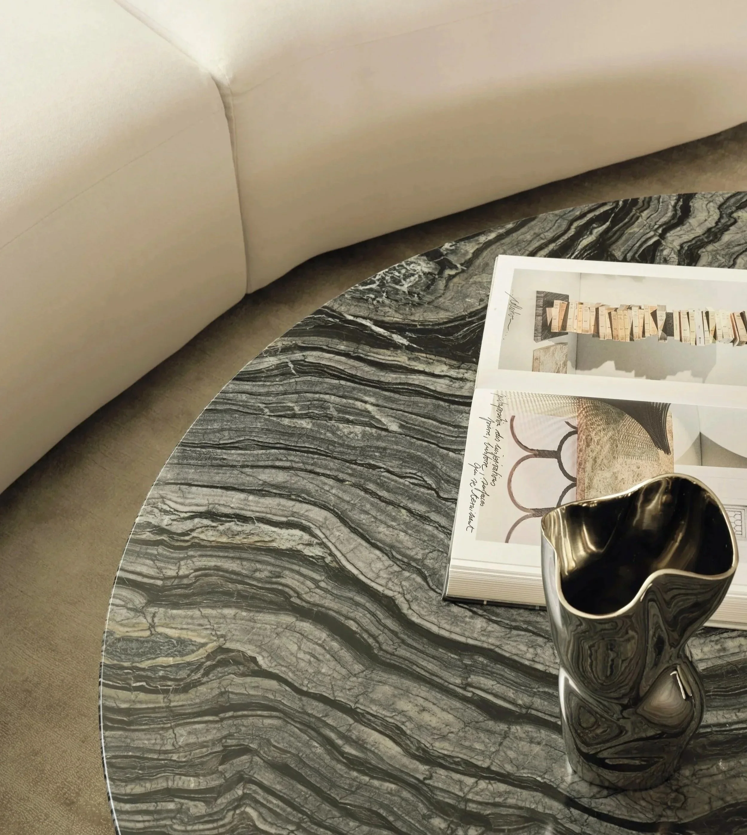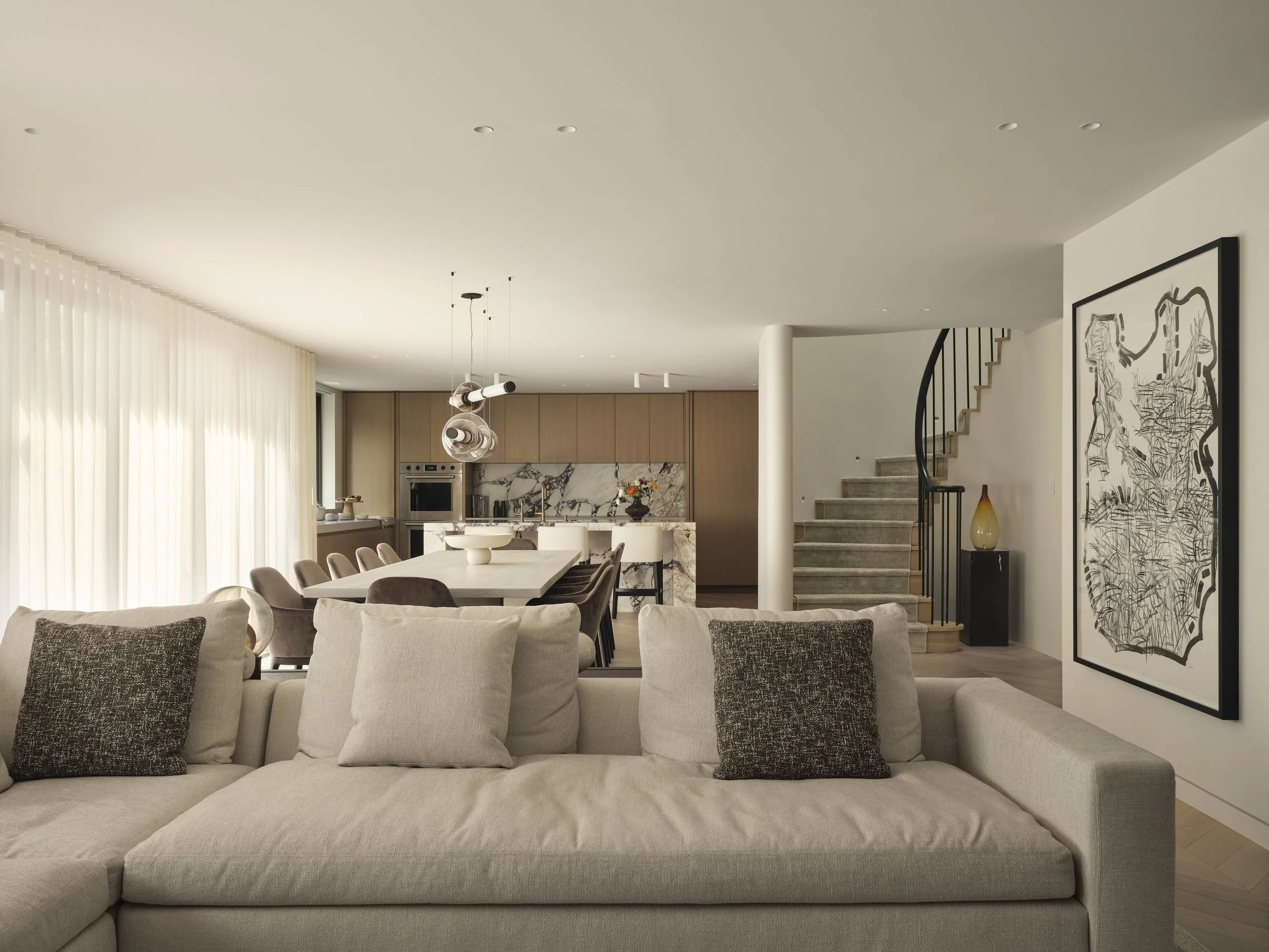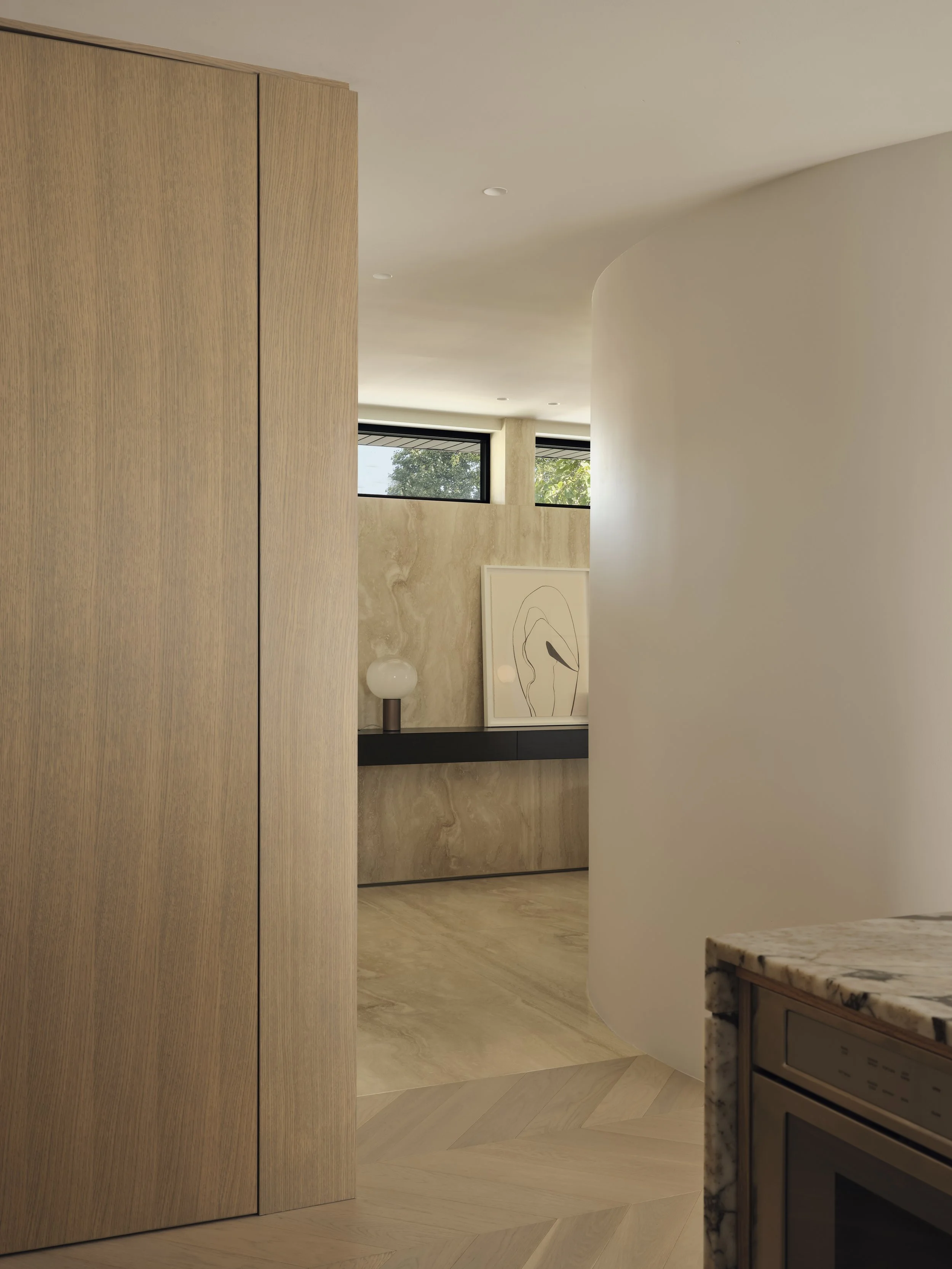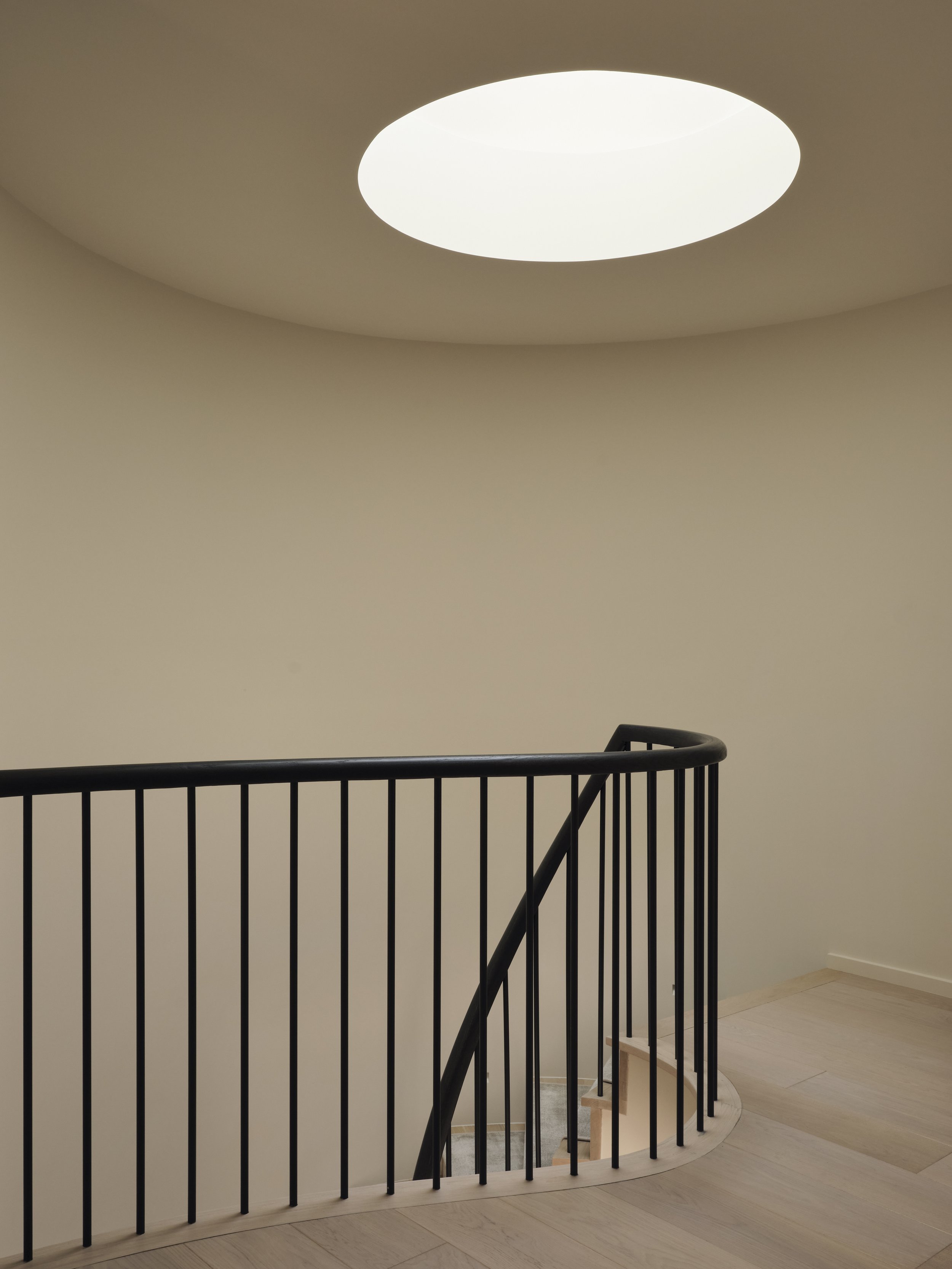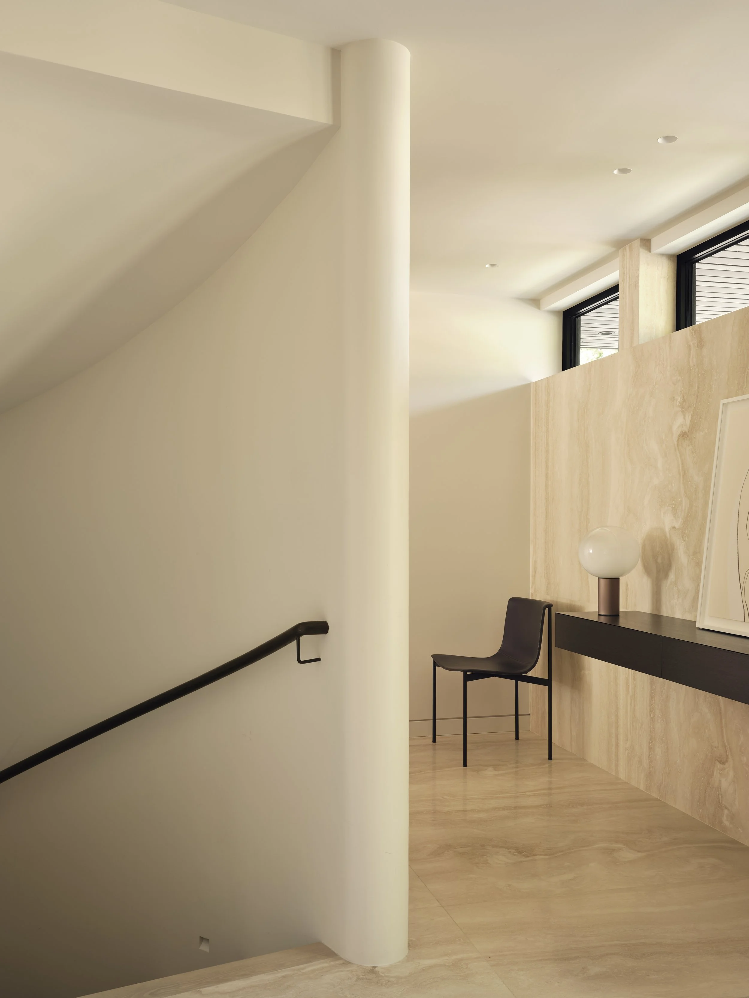 By following the curve of the circular staircase, we created a sculptural pathway that gives the room its sense of motion and poetry.
