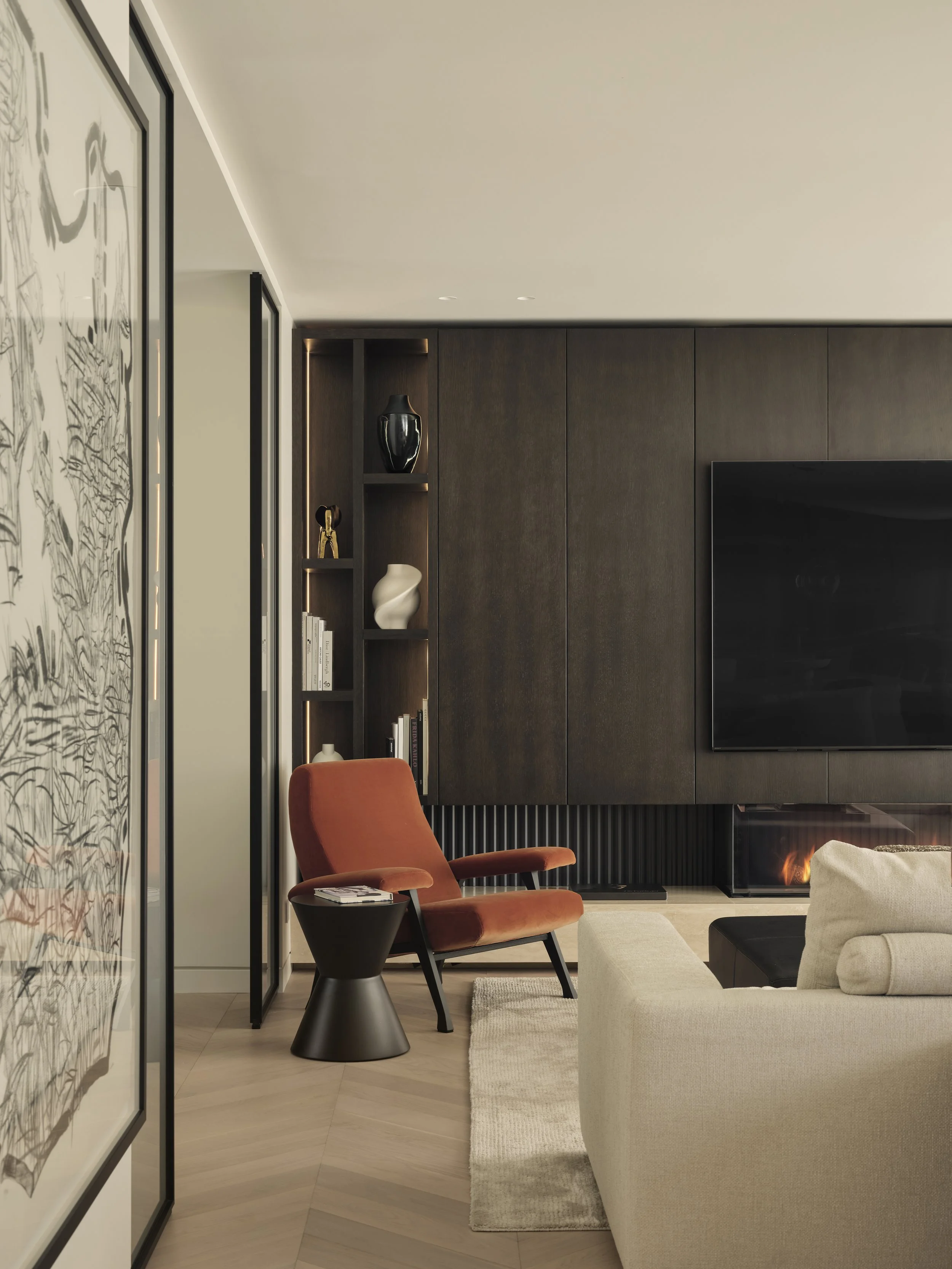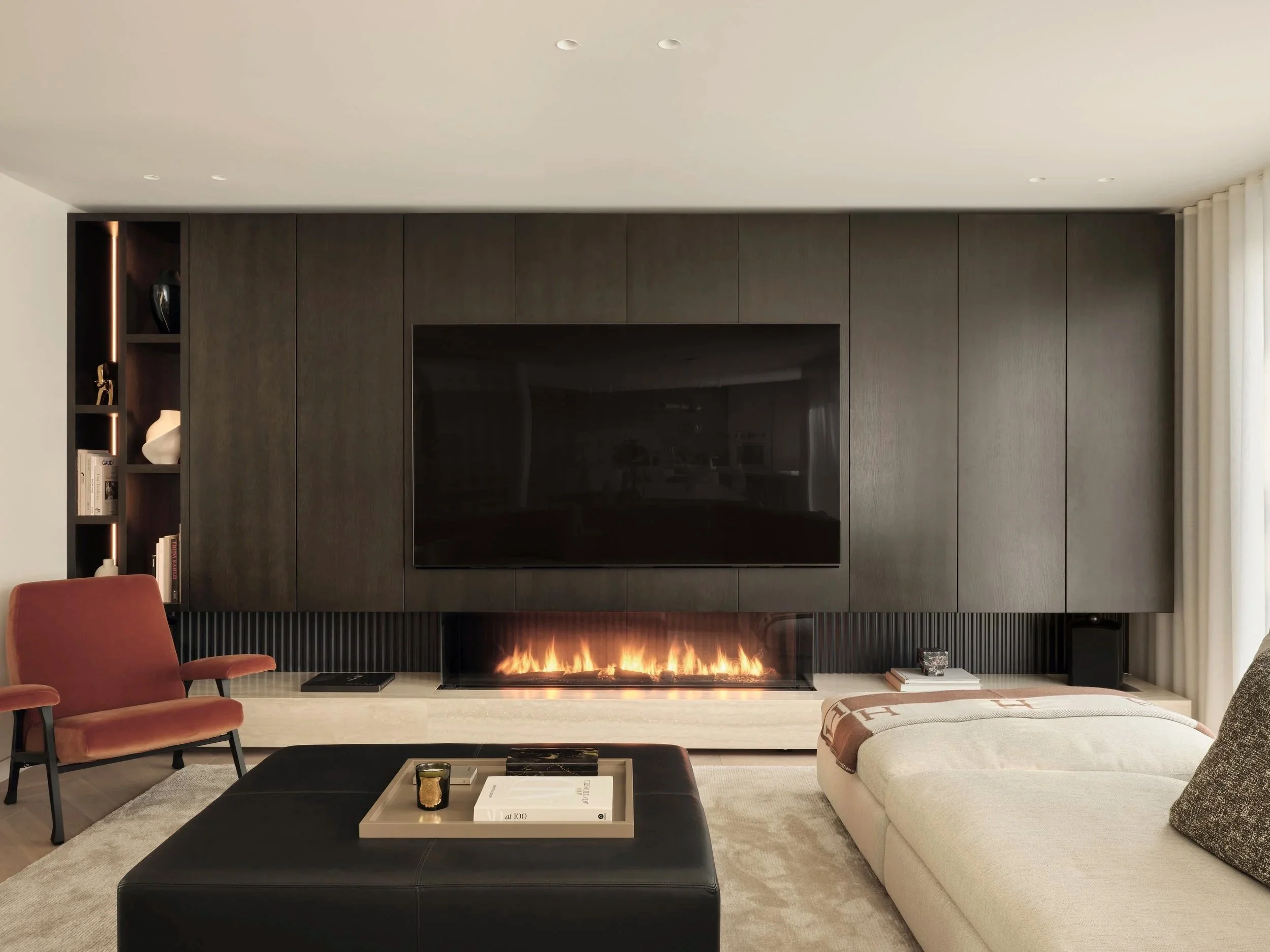 In the family room, a three-sided fireplace rests atop a travertine bench, framed by custom oak millwork that conceals discreet storage behind sleek paneled doors. A single open niche offers a curated space to showcase books and artful decorative accents, blending functionality and style.