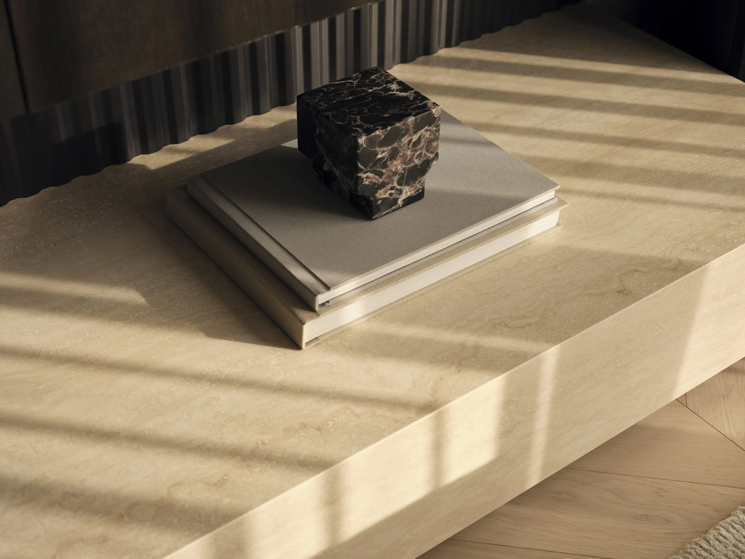 The entryway is lined with travertine slabs that flow seamlessly from floor to wall, adding warmth and a touch of luxury. A wall-mounted floating drawer provides convenient storage for mail, keys, gloves, and other daily essentials.